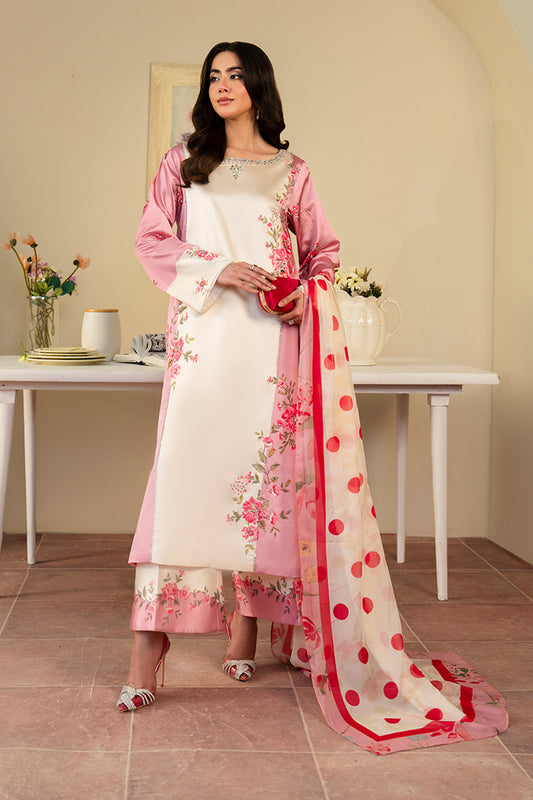 Digital Printed Cotton Satin ShirtEmbroidered Border on SleevesDigital Printed Self Jacquard DupattaPlain Cotton Satin TrouserEmbroidered...