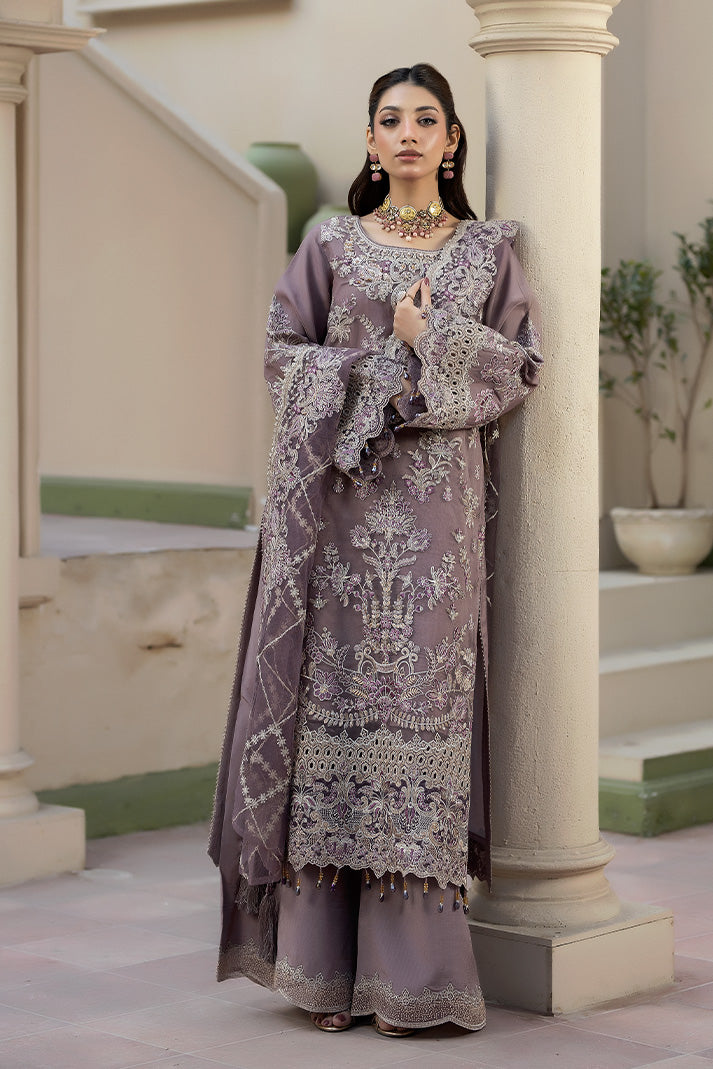 The look is crafted with an embroidered organza shirt enhanced by intricate handmade embellishments. An embroidered net dupatta adds lightness and charm, paired with an embroidered raw silk trouser for a cohesive and elegant silhouette.