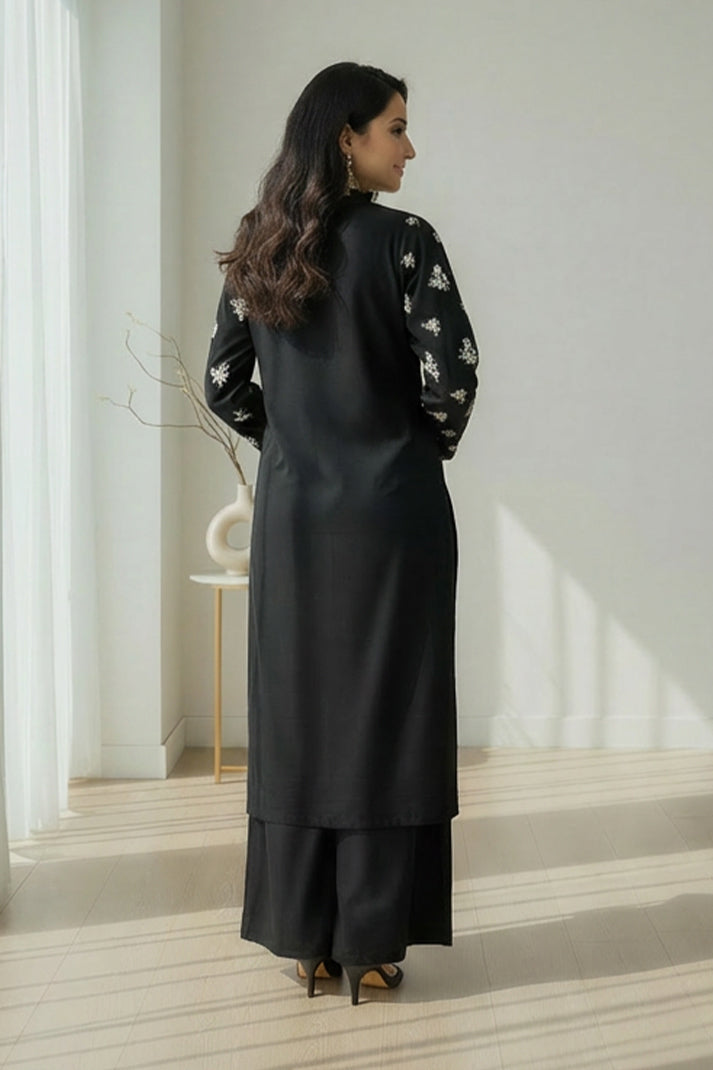 Intricate embroidery on the shirt, complemented by refined net work on the cuffs for added elegance.