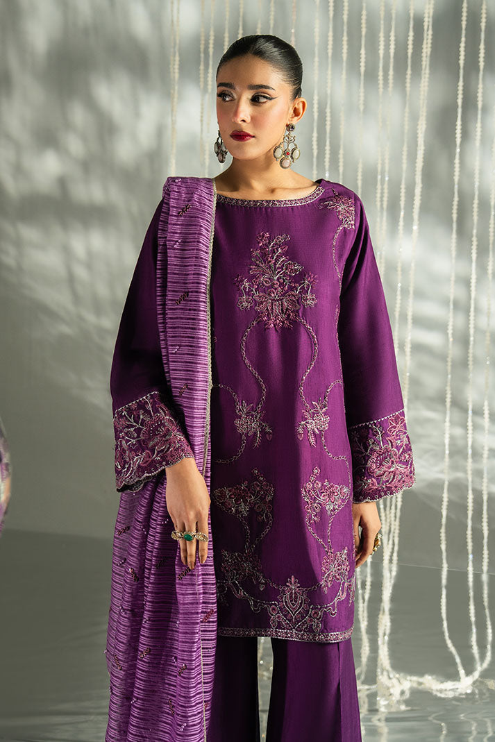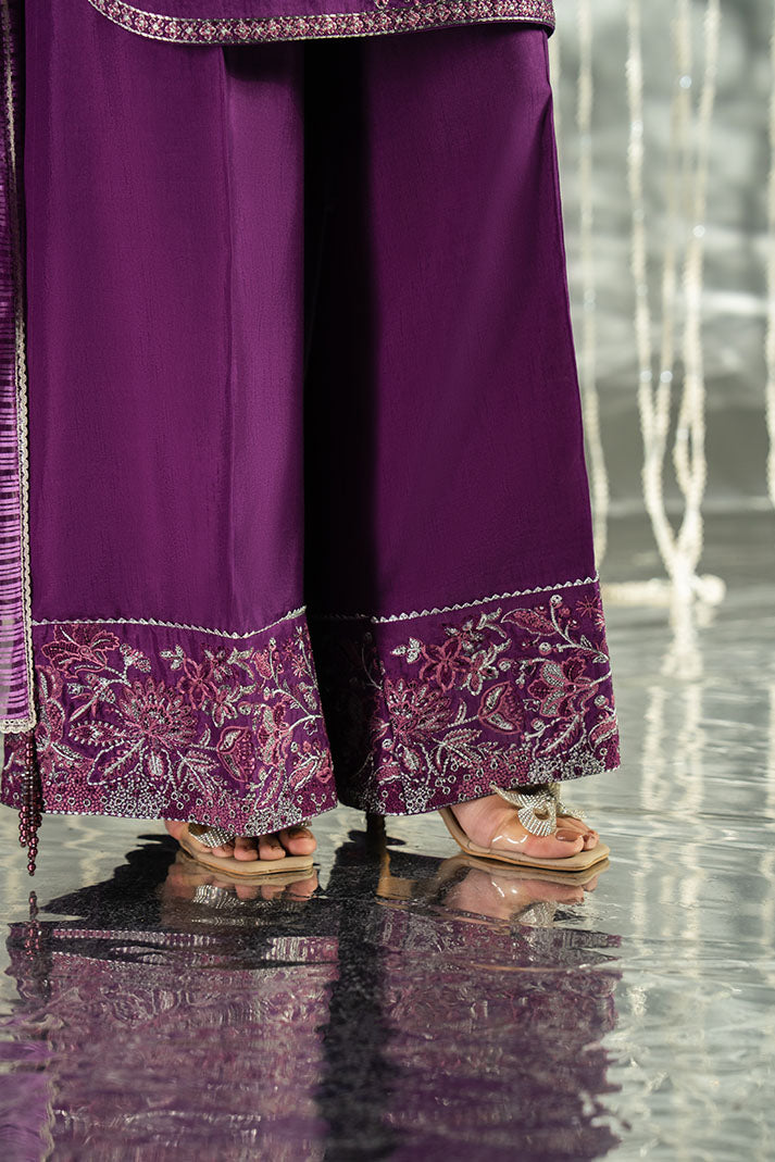 Lira radiates regal charm in a luxurious Royal Amethyst shade. The embroidered raw silk shirt is enhanced with fine craftsmanship, while the khadi organza dupatta adds a sheer, sophisticated finish. Paired with an embroidered raw silk trouser, this ensemble offers a perfect blend of tradition and modern luxury.