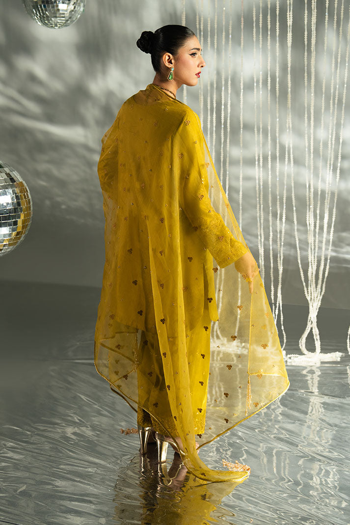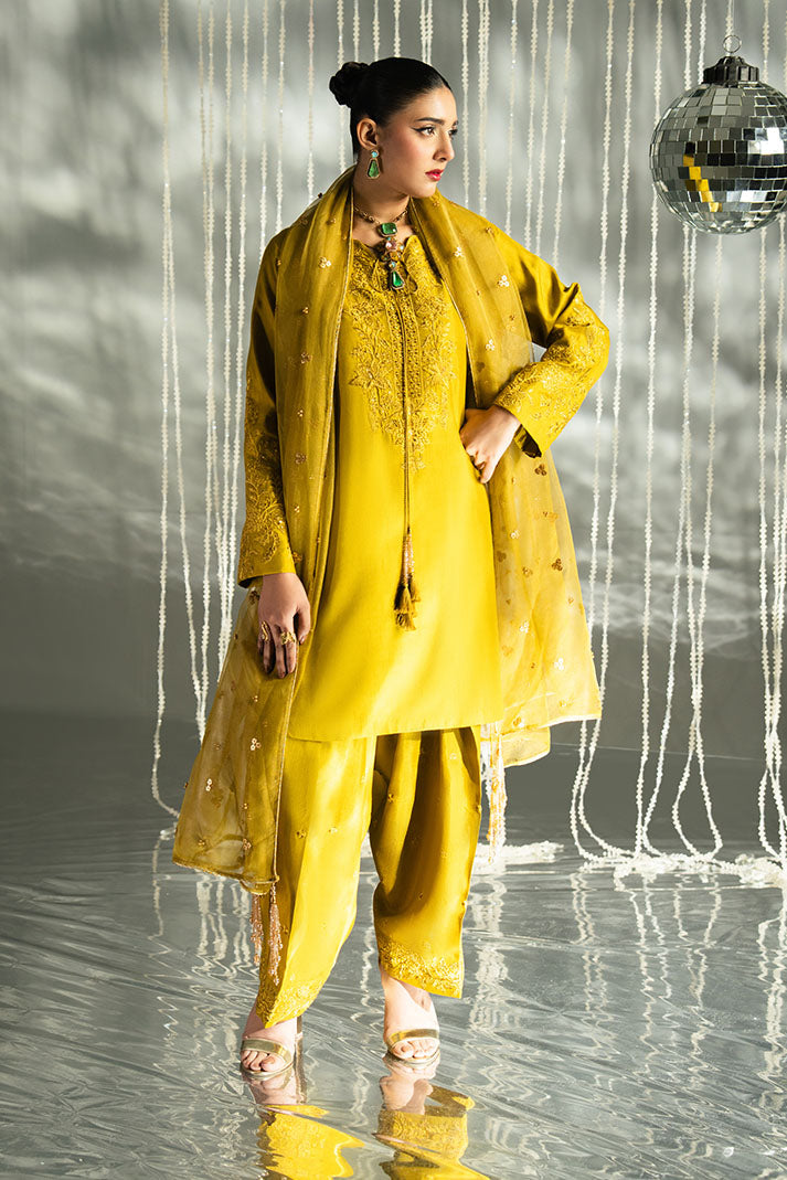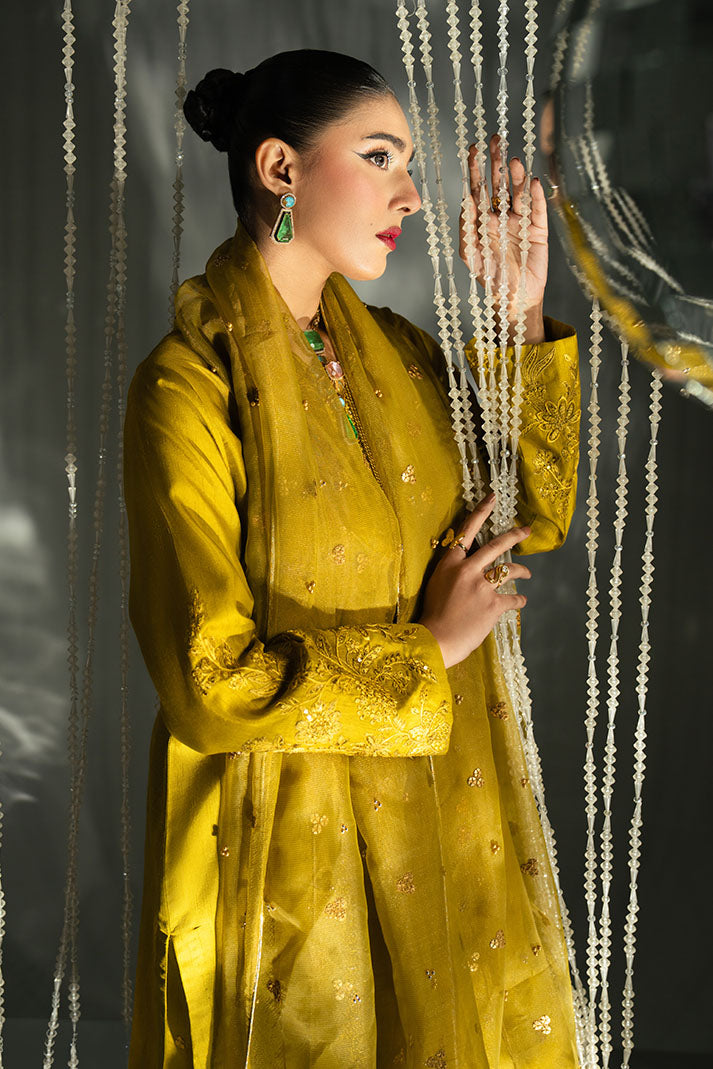 Naira is a timeless luxury ensemble crafted in an Antique Gold Mustard palette. The embroidered raw silk shirt reflects intricate detailing and richness, complemented by a delicately embroidered organza dupatta that adds lightness and elegance. Finished with a matching embroidered raw silk trouser, this design is ideal for festive and formal occasions.