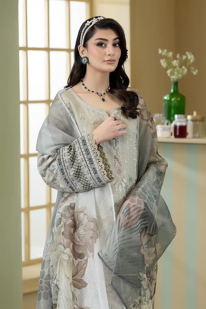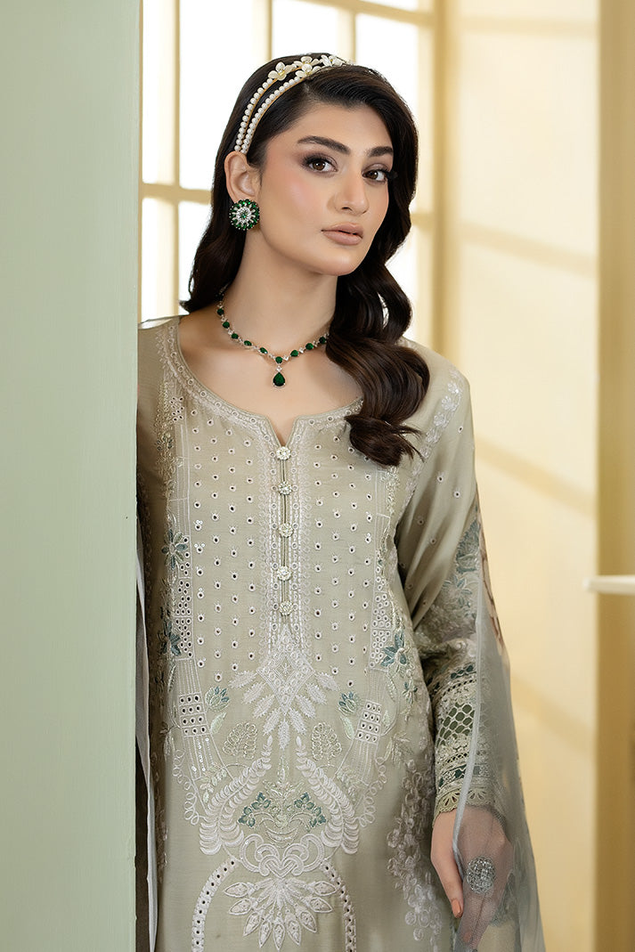 This ensemble includes an embroidered viscose shirt featuring intricate craftsmanship along the neckline, sleeves, and hem. It is paired with a printed khadi net dupatta that adds airy texture and delicate floral artistry. The embroidered viscose trouser, detailed with refined border work, ensures a polished and elegant finish.