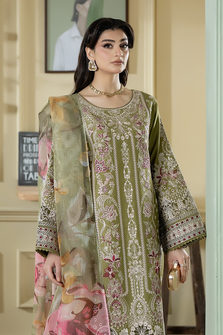 This design showcases an embroidered viscose shirt enriched with vertical patterns and ornate border detailing. The printed khadi net dupatta enhances the outfit with soft floral prints and graceful movement. Paired with an embroidered viscose trouser finished with intricate hem accents, the ensemble reflects timeless elegance.