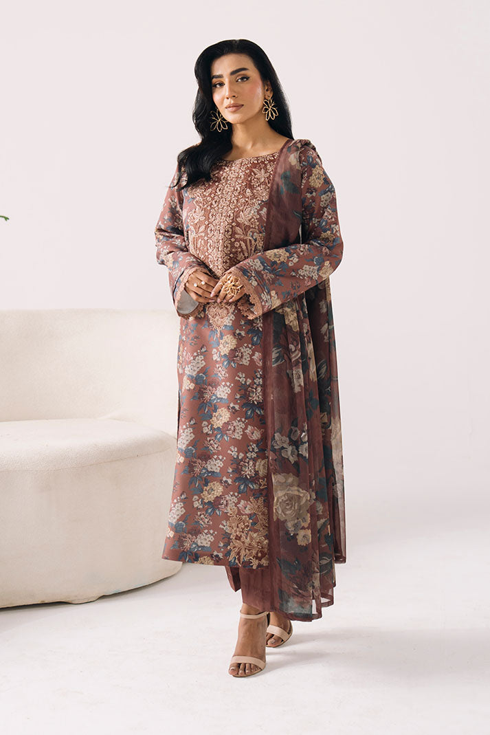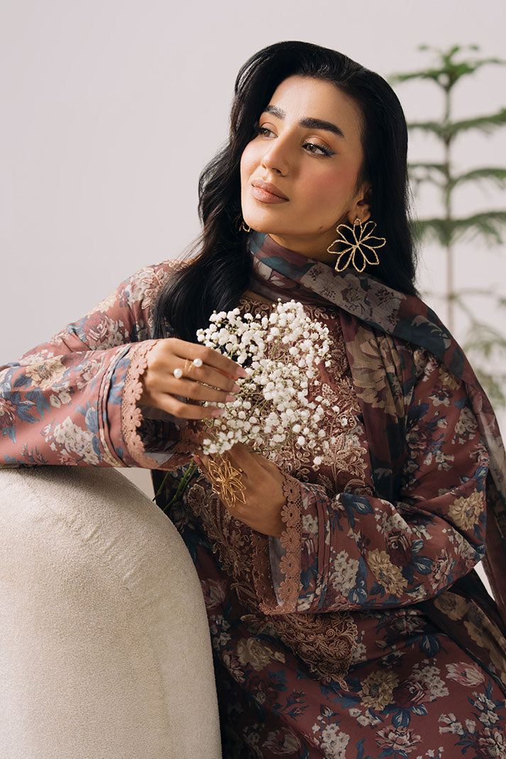 The printed lawn shirt is detailed with subtle embroidery for a polished look. A printed chiffon dupatta brings softness and movement, paired with a printed lawn trouser for easy wear.