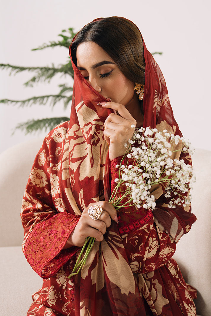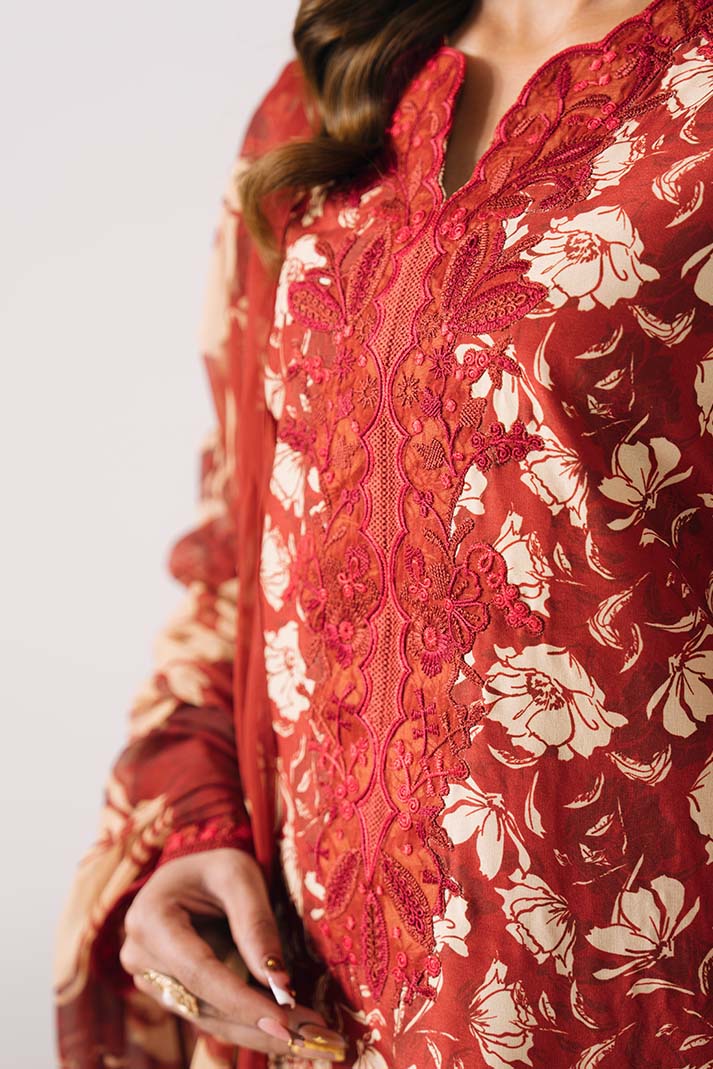 This design showcases a printed lawn shirt with intricate embroidered detailing for an elegant finish. The printed chiffon dupatta enhances its airy appeal, paired with a printed lawn trouser for breathable comfort.