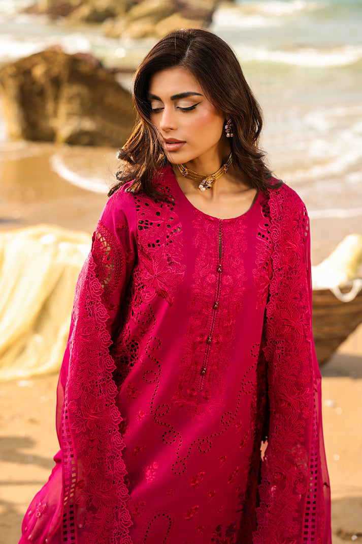 Crafted in rich tones, this design showcases an embroidered lawn front complemented by a plain lawn back and intricately embroidered sleeves. The ensemble is paired with an embroidered chiffon dupatta for an elevated finish, while the plain cotton trouser balances comfort and style. Detailed organza motifs on the front, sleeves, and trouser, along with embroidered borders, add depth and artisanal charm to the outfit.