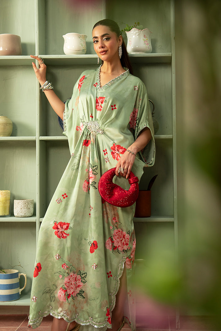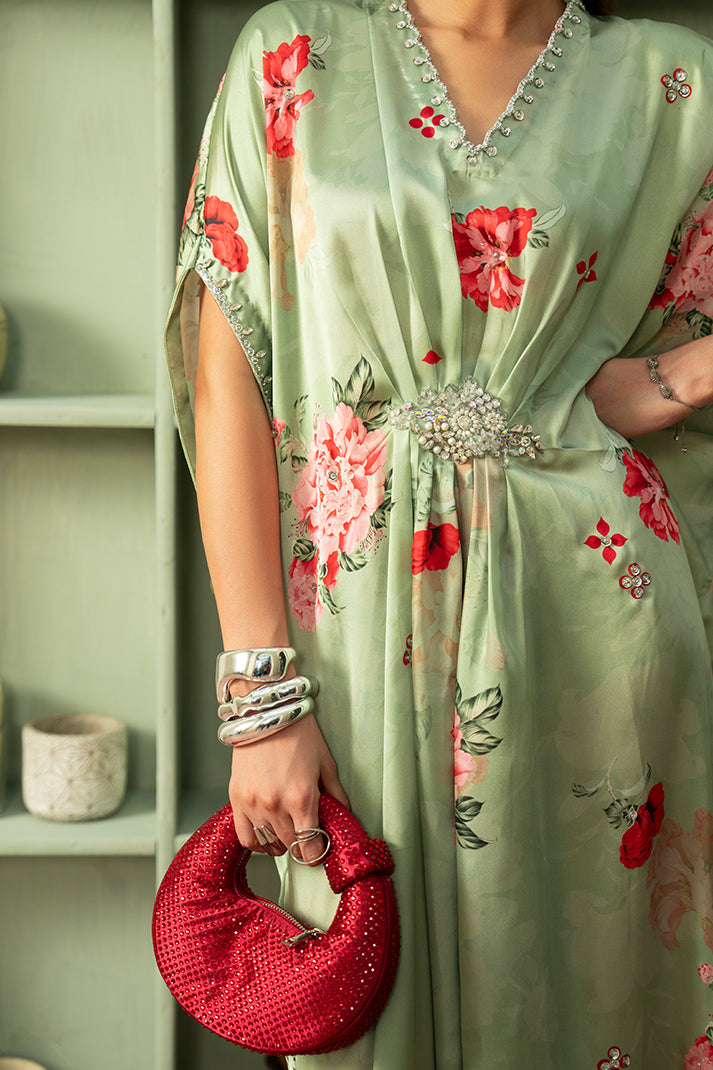 Printed shamooz silk kaftaan embellished with handmade.