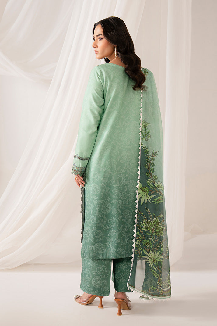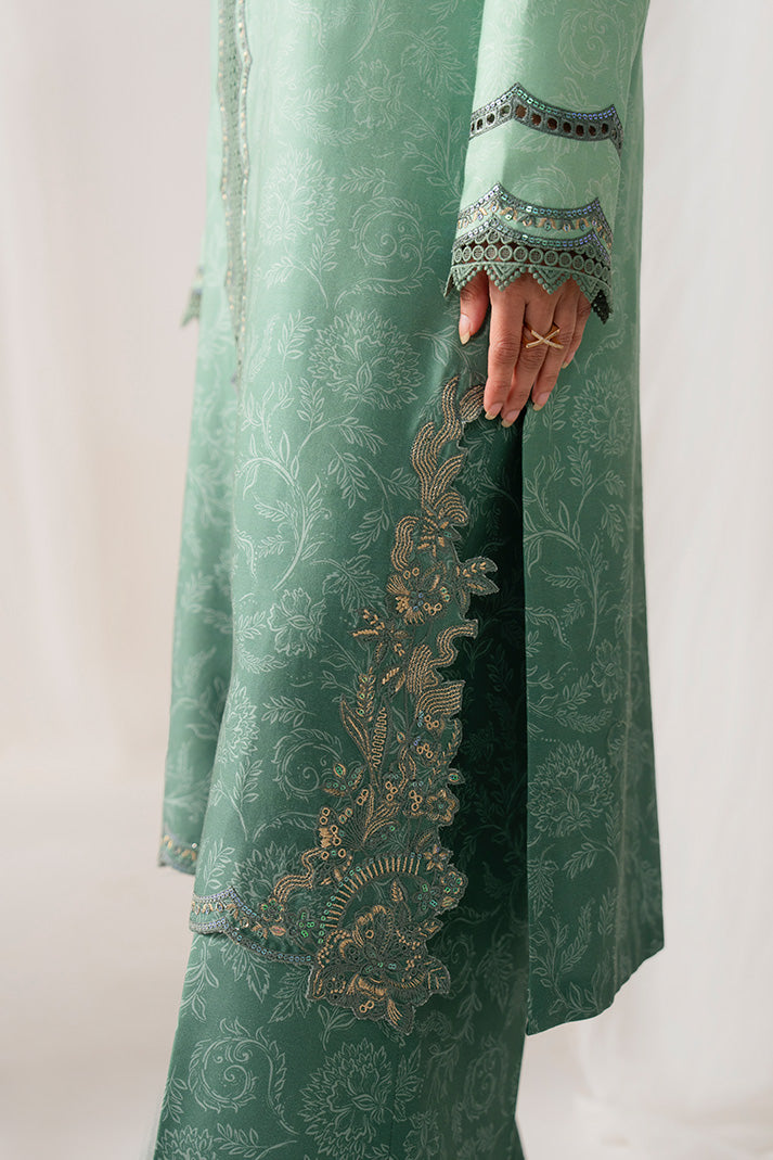 Printed cotton satin long shirt with subtle embroidery on the neckline and sleeves, maintaining a clean and minimal aesthetic. Accompanied by a printed silk dupatta with delicate lace detailing on the borders. Finished with a printed cotton satin straight trouser for everyday elegance.