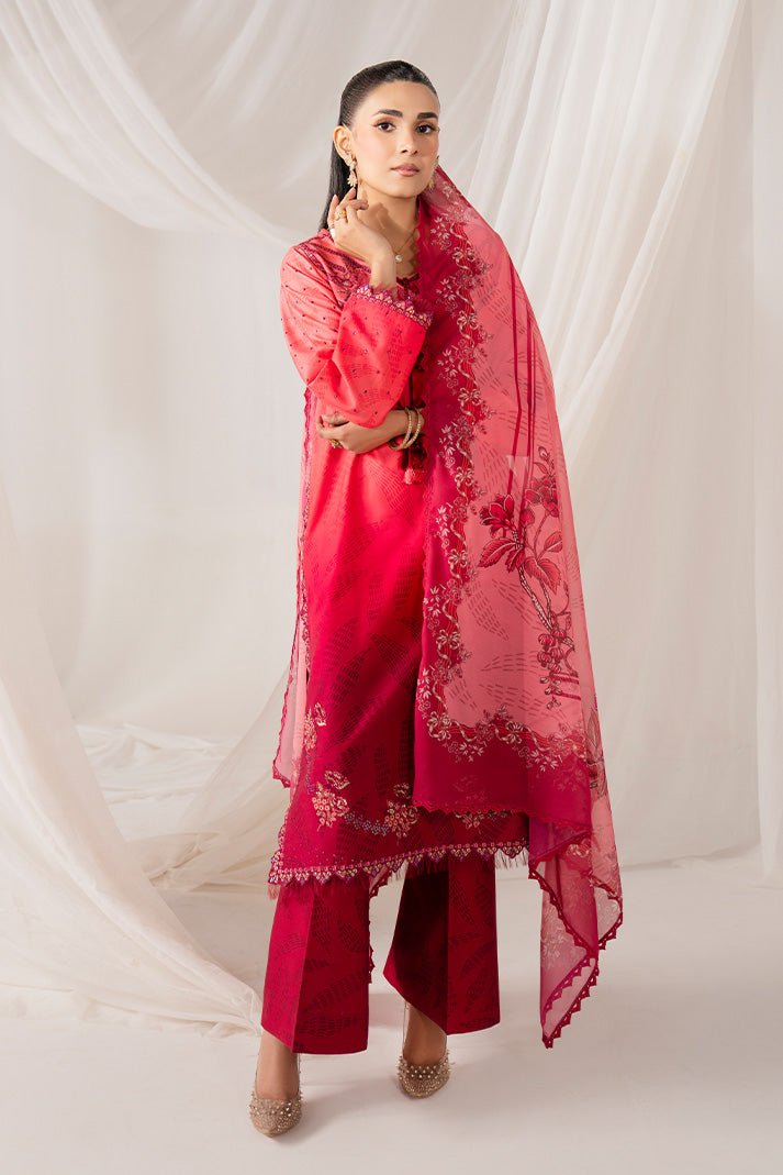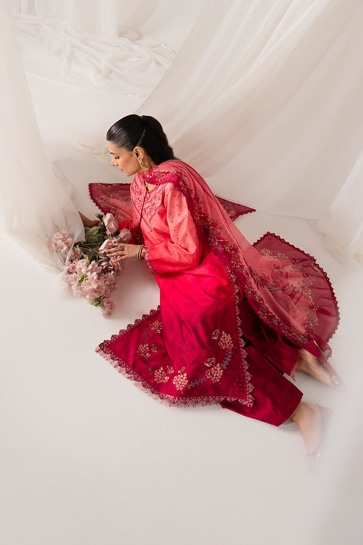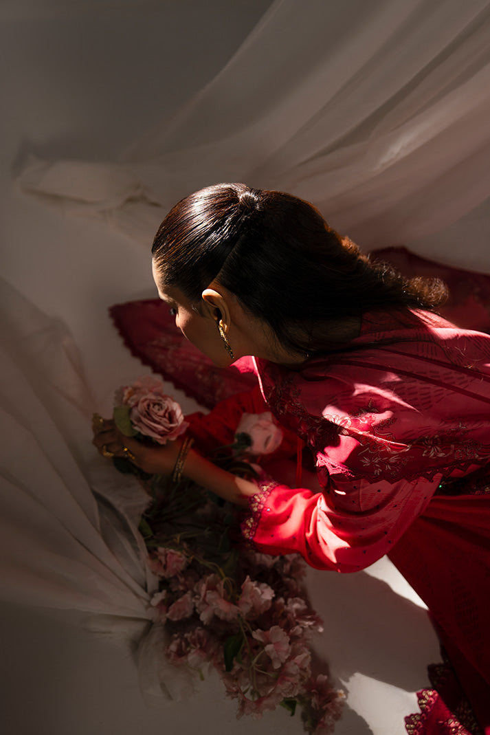 Printed cotton satin long shirt featuring delicate embroidery on the neckline and sleeves, adding elegance to the vibrant coral-red palette. Paired with a printed silk dupatta finished with lace edging. Completed with a printed cotton satin straight-cut trouser for a confident pret finish.