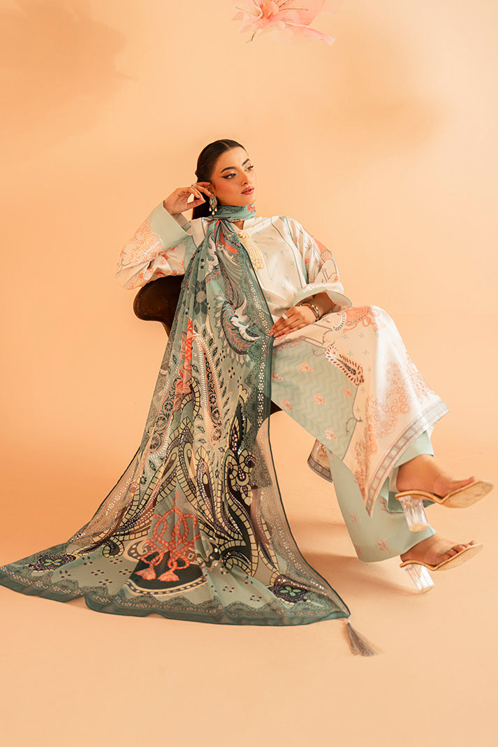 Celeste Bloom is crafted from premium printed silk, offering a soft texture with an elegant, fluid fall. The digitally printed silk shirt is paired with a coordinated printed silk trouser for a refined, polished look. A beautifully designed printed chiffon dupatta completes the ensemble, adding a lightweight and graceful drape that enhances its timeless charm.