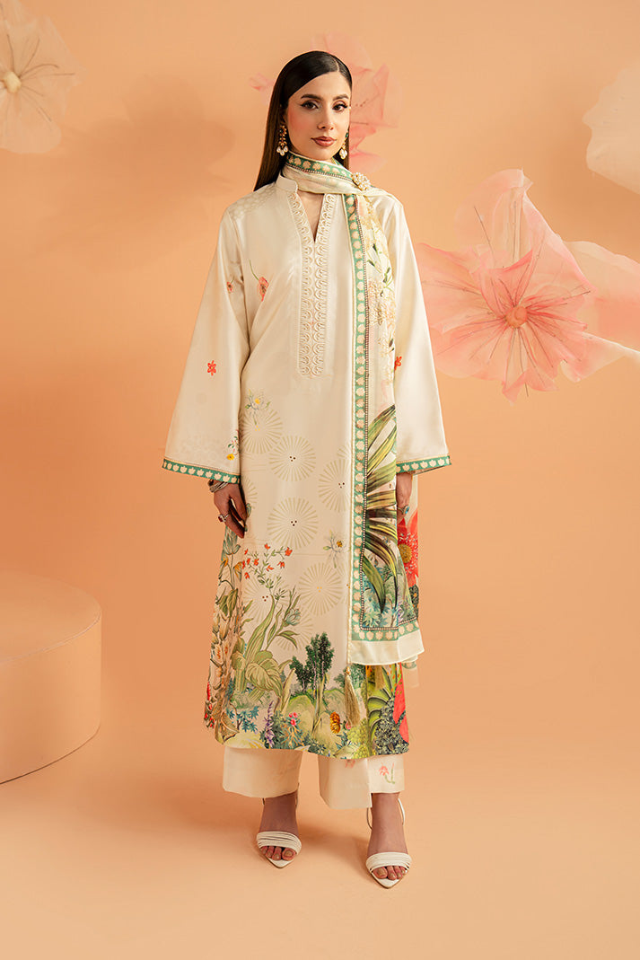 Ivory Botanica is crafted in premium printed silk featuring delicate botanical-inspired digital artwork. The coordinating printed silk trouser enhances the overall sophistication of the outfit. A printed chiffon dupatta with a soft, airy drape completes the look, offering a refined and polished aesthetic.